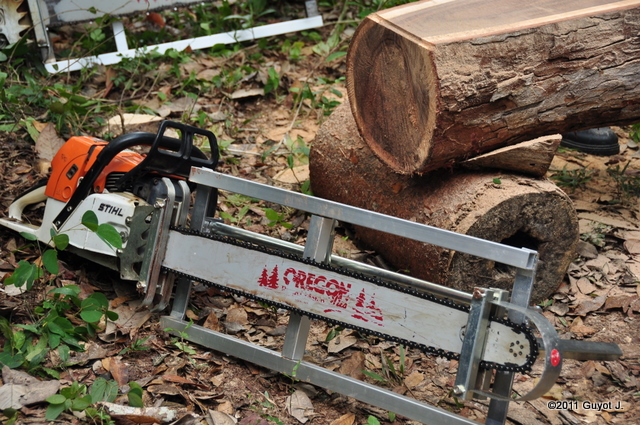 Qui aurait de lexperience sur le sciage de long de grumes en utilisant un chariot fixe au guide une tronconneuse a chaine.
